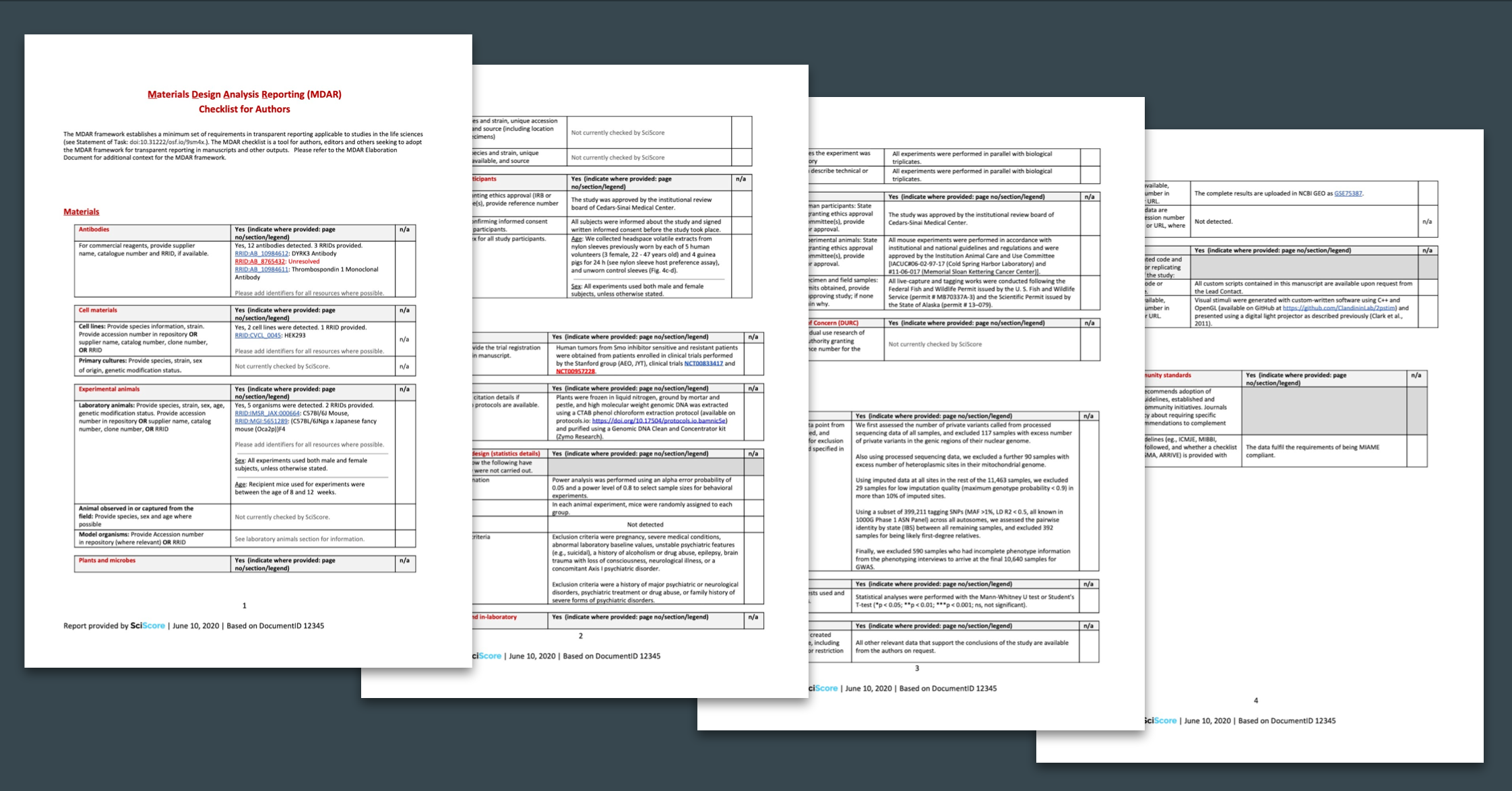 With every submission to our systems, SciScore returns an MDAR checklist (in addition to our other reports), which is partially completed automatically using information detected in your research. You will most likely need to fill in additional information depending on your research topic as SciScore is currently only trained to detect a limited number of criteria, shown below. In the checklist, we note missing information with a "Not detected" and information not currently checked with a "Not currently checked by SciScore". If SciScore makes substantial mistakes with your manuscript, please contact us to help us learn from our mistakes.